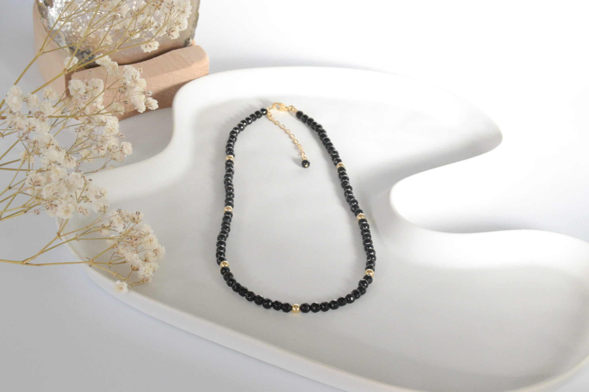 Steen: Onyx 4 mm facet geslepen Edelmetaal: 925 sterling zilver of gold filled Lengte ketting: 39 cm + 5 cm verlengketting