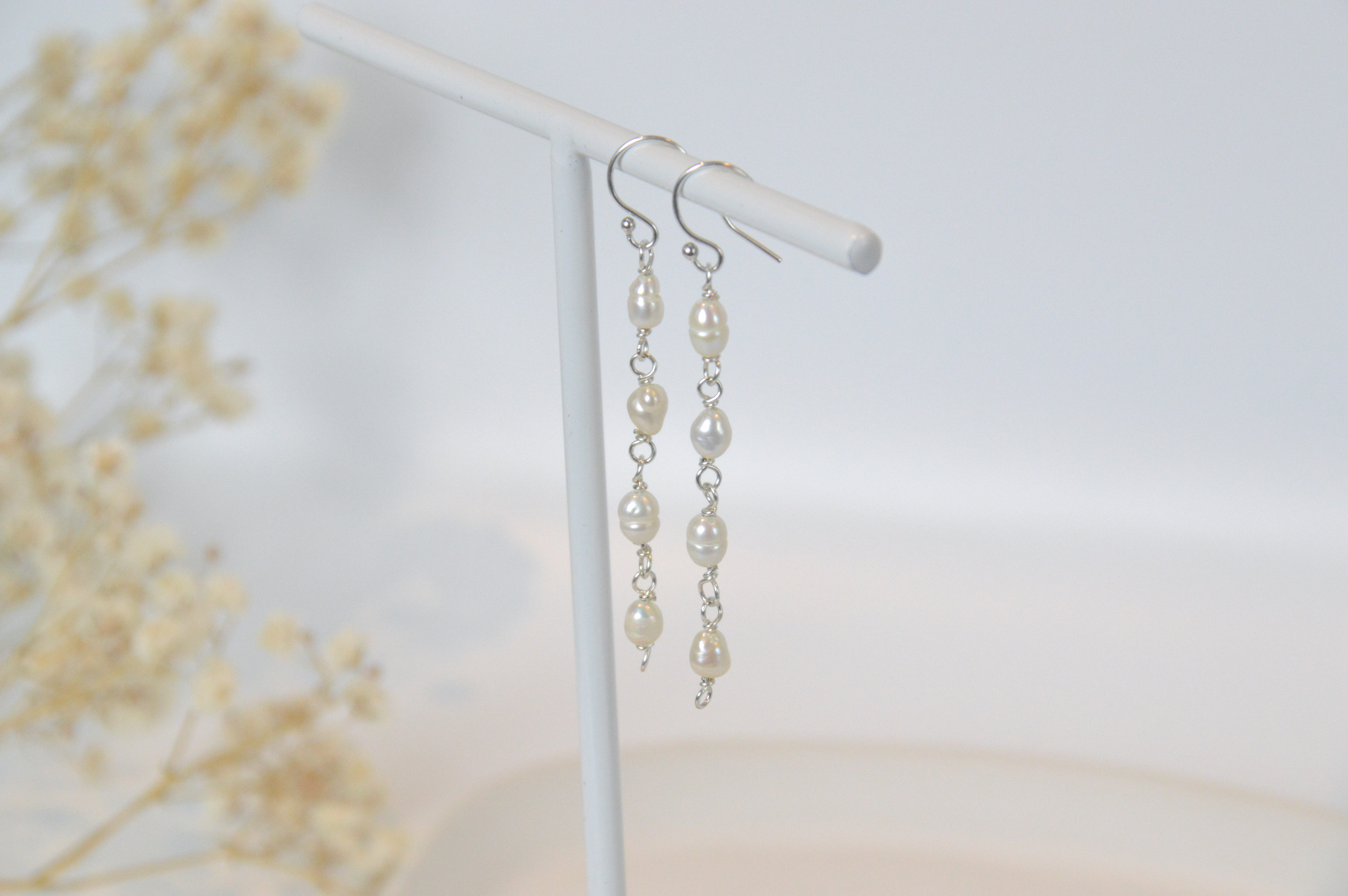 Steen: Zoetwaterparel 4 mm Edelmetaal: 925 sterling zilver of gold filled Oorbel grootte: 5 cm lang